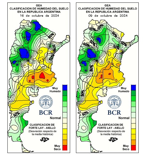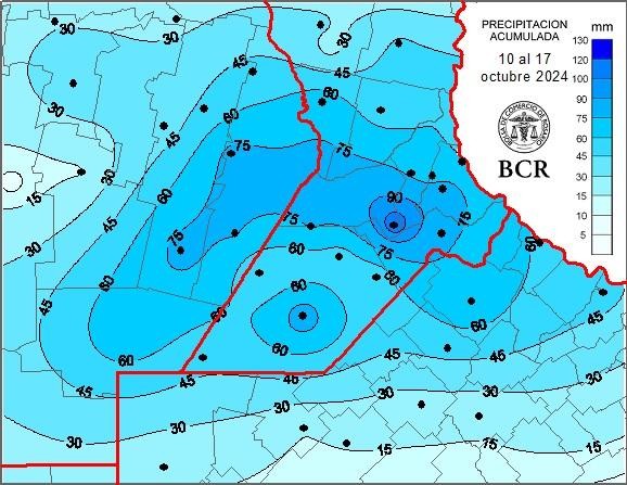 El cultivo se deterioraba semana a semana y los descuentos en rindes no paraban. Había 650.000 ha de trigo en condiciones regulares a malas, pero, tras las lluvias, se redujeron a 325.000 ha. Entre el 10 y el 17 de este mes, la región recibió en promedio 60 mm (de las 36 estaciones GEA/BCR), cuando octubre suele dejar en todo el mes 100 mm. Las lluvias fueron ampliamente superadoras a los pronósticos por un frente estacionario que se desplazó muy lentamente. El máximo registro fue el de Bigand con 108,6 mm. En numerosas estaciones del centro de la región núcleo y del SE cordobés los totales en lo que va de octubre alcanzaron de 80 a 90 mm. Por otro lado, el mínimo registro fue el de General Pinto con 16 mm. En varias localidades del extremo norte bonaerense, los totales son de 16 a 20 mm.