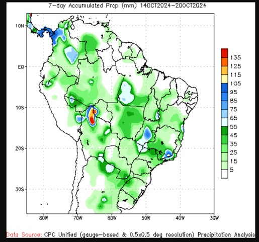 Mato Grosso, Mato Grosso do Sul y Pará vienen con escaso nivel de lluvias. El mapa es claro.