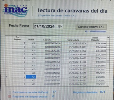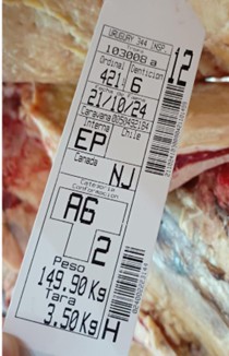 Al pasar por las ½ reses por el palco de faena se emiten etiquetas que se colocan en cada cuarto de la ½ res, etiqueta que contiene información numero de tropa, numero de orden (garrón), numero de caravana del animal que le dio origen, numero de Renspa (allá lo llaman DICOSE) del productor que lo envió, categoría, sexo, peso y dentición y toda la información de la tipificación según el protocolo de destino (la de Uruguay, Chile y Canadá, que son las diferentes, en este caso).