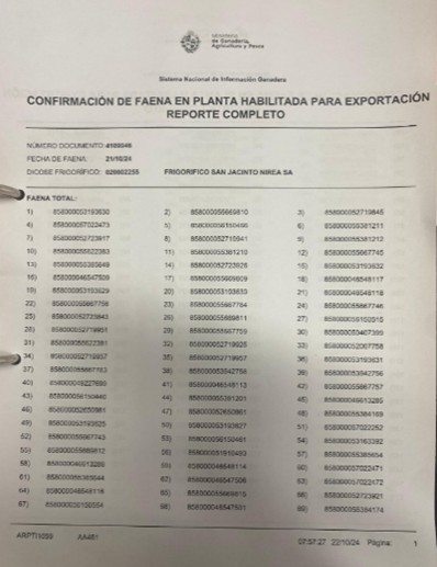 Al finalizar la faena el Ministerio de Ganadería, Agricultura y Pesca, emite el listado de todos animales faenados con su numero individual relacionando, de la misma forma que l listado anterior numero de orden (garrón) con caravana. Detallando fecha de faena y Renspa, además de Frigorífico y otras.