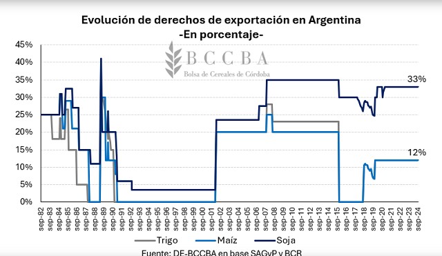 Los derechos de exportación (DEX), tributo que grava los bienes exportados en función de su valor FOB, tienen una historia prolongada en Argentina. A comienzos de los 90, bajo el Plan de Convertibilidad, se eliminaron los DEX al maíz, trigo y subproductos de soja, con excepción del poroto de soja, que mantuvo una tasa del 6% y, posteriormente, se redujo al 3,5% en 1992. Sin embargo, en 2002, al finalizar la convertibilidad, el Gobierno Nacional los reintrodujo en su política tributaria, con una tasa inicial del 10% que luego subió al 20% y se mantuvo durante cinco años.
