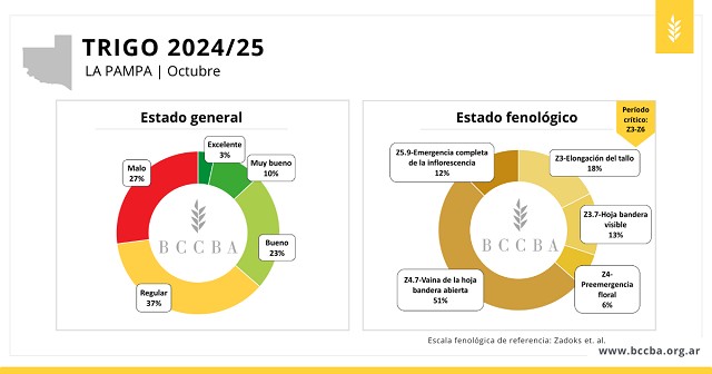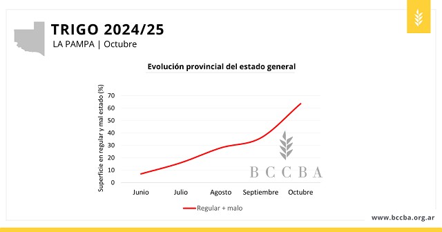Hacia mediados de octubre, el trigo en la provincia se encontraba en pleno período crítico, etapa clave en cuanto a la necesidad hídrica para la definición de rendimientos, y el 64% de los lotes presentaba entre regular y mal estado general, proporción que casi duplica la observada en septiembre. Este deterioro se atribuye principalmente a la escasez de precipitaciones durante lo que va del ciclo del cultivo hasta la fecha de relevamiento, agravada por las intensas heladas de julio y agosto. Según reportó casi la totalidad de los colaboradores, estas condiciones generaron síntomas de estrés hídrico y térmico en el cereal, con grados de afectación que van de moderado a alto.