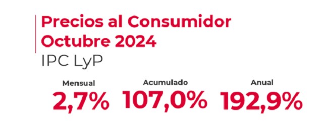 De esta manera, en los primeros diez meses del año el IPC acumula una suba de 107,0%, mientras que a la misma altura del año pasado la inflación acumulada fue de 120,0%. En cuanto a la variación interanual alcanza el 192,9%, marcando la sexta desaceleración consecutiva y lleva bajados 96,5 puntos porcentuales desde el máximo de 289,4% interanual registrado en abril.