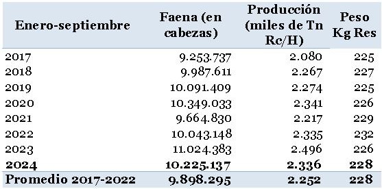 Asimismo, la faena vacuna se ubicó en los primeros 9 meses del año en 10,22 millones de cabezas. Sin considerar el atípico 2023, el nivel de faena resultó superior al promedio del periodo 2017-2022 que fue de 9,9 millones de cabezas.