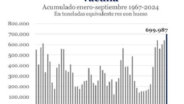 Las ventas externas de carne vacuna acumularon en el período enero-septiembre 2024 un volumen de 699.987 toneladas, equivalentes res con hueso por 2.122 millones de dólares, lo que representa el registro más alto de los últimos 57 años, informó la Secretaría de Agricultura, Ganadería y Pesca del Ministerio de Economía de la Nación.