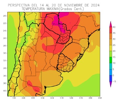 El nordeste del NOA, gran parte de la Región del Chaco, la mayor parte del Paraguay, el norte de Santa Fe y la mayor parte de Corrientes observarán temperaturas máximas superiores a 35°C, con un foco calurosos con registros superiores a 40°C sobre el Paraguay.