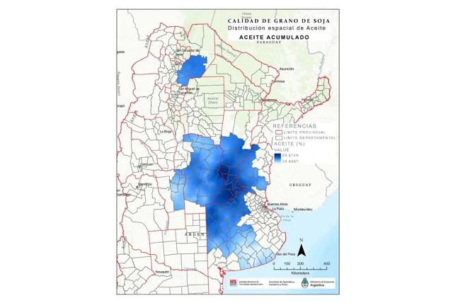En relación con los datos de aceite, el mapa indicó que el valor medio nacional fue 22,3 % (bs): el valor medio más alto corresponde a Núcleo con 23,4 % (bs), mientras que el más bajo a Buenos Aires Sur con un 20,1 % (bs). Esta última región presentó el valor medio más bajo de aceite en las dos campañas relevadas.