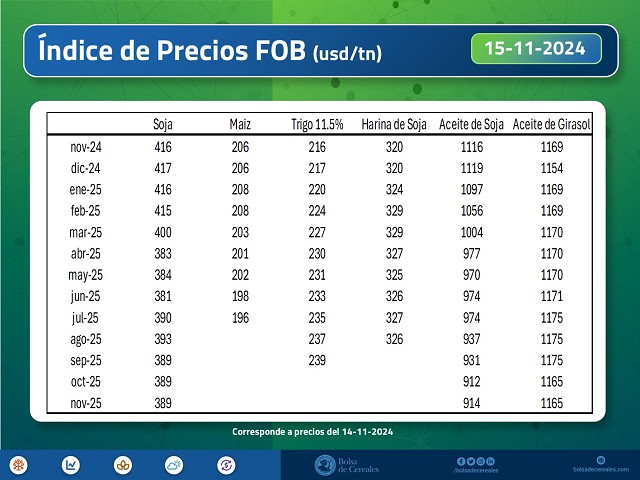 Por su parte, la Bolsa de Cereales presentó, valores FOB para el aceite crudo (7 de Noviembre) de U$S/tn 1.134 para Noviembre; 1.148 para Diciembre y 1.132 para Marzo de 2025.