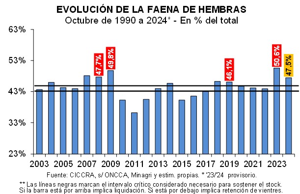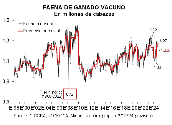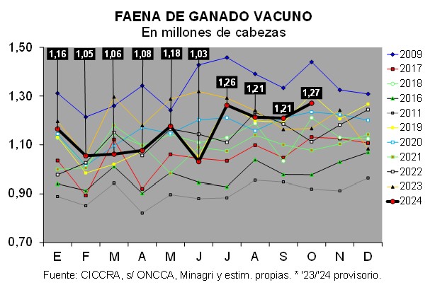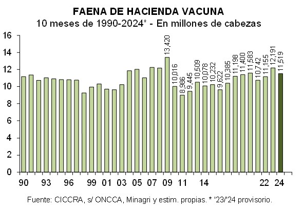 En enero-octubre de 2024 un total de 366 establecimientos faenó 11,52 millones de cabezas de hacienda vacuna, es decir 5,5% menos que en el mismo período de 2023 (-671,87 mil cabezas). Este período se ubicó en el puesto Nº 11 entre los últimos cuarenta y cinco años, cuando la faena de los primeros diez meses de 2023 alcanzó la posición Nº 5. Todo esto es consistente con el impacto que tuvo la gran seca durante 2023, que forzó la venta anticipada de hacienda y la reducción del stock de vientres, y que afectó negativamente la preñez y parición de terneros cuyo impacto se observó en la primera parte de 2024.