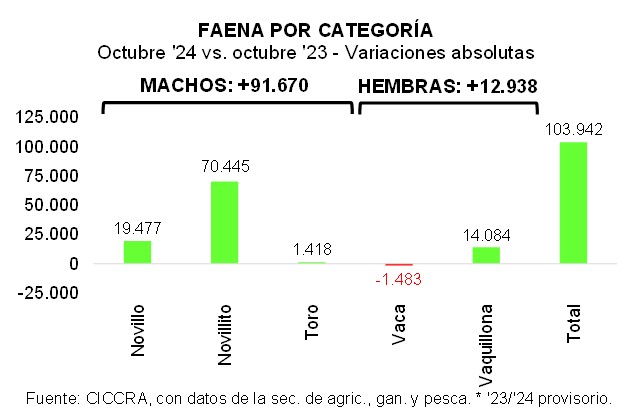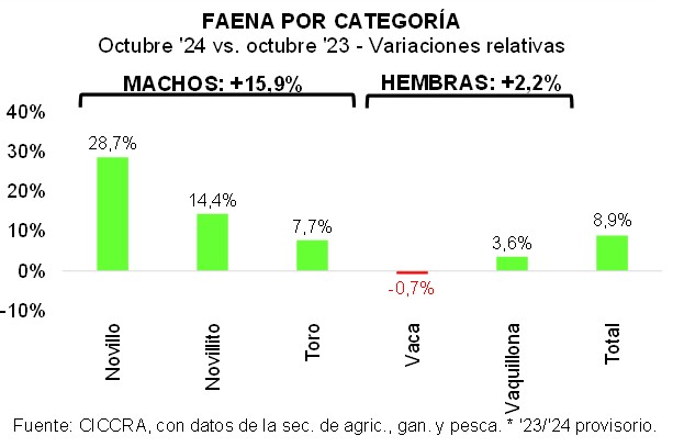 La faena de machos cayó 4,8% en los primeros diez meses del año, totalizando 6,02 millones de cabezas (-300,77 mil cabezas). Del total, 83% fueron novillitos (4,994 millones de cabezas) y 14,0% fueron novillos (843,3 mil cabezas). En comparación con enero-octubre de 2023 la faena de novillitos cayó 4,3% y la de novillos hizo lo propio en 8,0%.