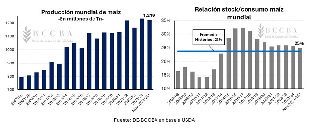 En su última estimación, el USDA incrementó la producción mundial de maíz para la campaña 2024/25 en aproximadamente 2 millones de toneladas respecto a lo que esperaba el mes anterior, posicionándose en 1.219 millones de toneladas. Sin embargo, cae respecto al ciclo anterior en 10 millones de toneladas. Por su parte, el consumo global alcanzaría un récord de 1.229 millones de toneladas para la nueva campaña, lo cual provocaría una reducción de los stocks y ubicaría a la relación stocks/consumo en 25%, la menor de los últimos once años.