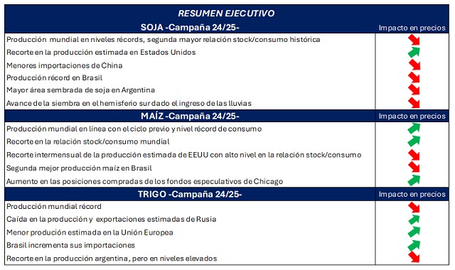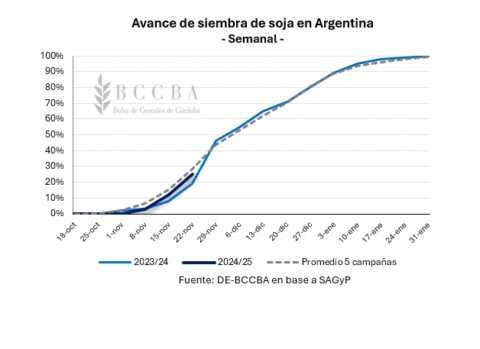 Dada las últimas lluvias presentadas en el hemisferio sur, bajo mejores condiciones que la campaña anterior, comienza a avanzar la siembra de los cultivos estivales. En Argentina, la siembra 2024/25 según la Secretaría de Agricultura, Ganadería y Pesca de la Nación (SAGyP), se encuentra con un avance del 25% sobre una superficie estimada de 17,8 millones de hectárea. Siguiendo a la Bolsa de Comercio de Rosario (BCR) estima una producción que se ubicaría entre 51 y 52 millones de toneladas, contemplando un incremento en el área dedicada a la oleaginosa.