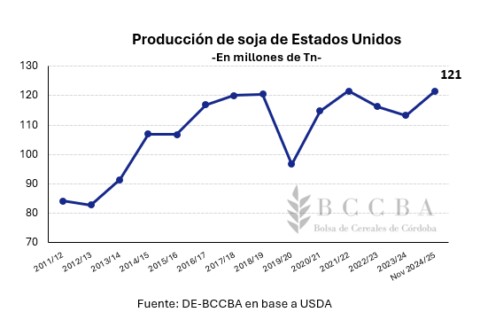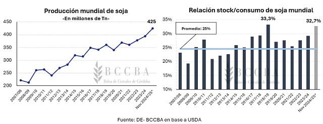 De acuerdo con el último reporte del Departamento de Agricultura de los Estados Unidos (USDA), a nivel global la producción de soja ha sido recortada respecto a su informe de octubre, aunque seguiría ubicándose como un récord en 425 millones de toneladas. Por el lado de la demanda, el consumo se ubicaría en el nivel más alto de la historia con 402 millones de toneladas. Sin embargo, aún las existencias son elevadas lo cual limita las posibles subas en el precio de la oleaginosa, ubicando la relación stock/consumo como la más alta de los últimos años. En relación con las compras de China, principal consumidor mundial, se proyectan en 109 millones de toneladas, levemente por debajo de la campaña previa.