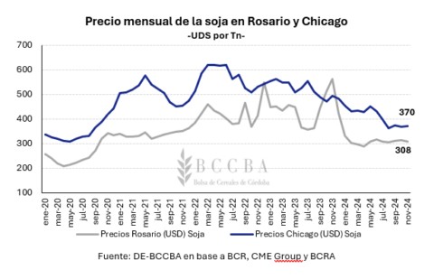 Desde principios de septiembre, la cotización de la oleaginosa se ha mantenido en niveles bajos en un contexto en donde aparecieron las lluvias en el hemisferio sur y la gran cosecha estadounidense que brindan tranquilidad en el mercado. El valor de la oleaginosa en el mercado local para lo que va de noviembre se ubica en USD 308 toneladas, mientras que en Chicago la cotización mensual ronda los USD 370 toneladas.