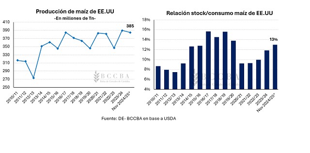 En Estados Unidos el avance de cosecha alcanza el 95% del área, ubicando a los rendimientos como los más altos de su historia en 114,9 quintales de por hectárea. Sin embargo, son menores a los que se esperaba en octubre, por lo cual la producción estadounidense fue recortada en torno a 2 millones de toneladas. De esta manera, se ubicaría en 385 millones de toneladas. Por el lado de la relación stock/consumo se esperaría que continúe con la tendencia creciente de los últimos años ubicándola en 13%, ya que el consumo interno junto a las exportaciones del cereal alcanzaría los 381 millones de toneladas en dicho país.