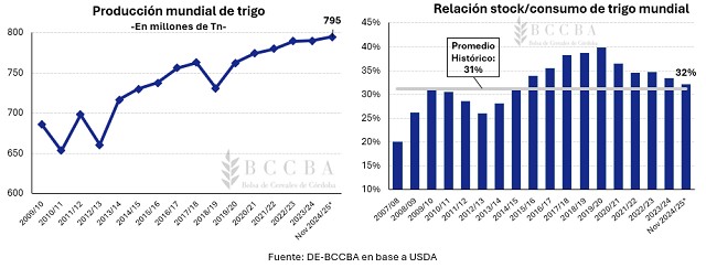 En su informe de noviembre el USDA estimó la producción mundial de trigo en 795 millones de toneladas, lo que implicó un incremento respecto a octubre, manteniendo su posición récord. Este aumento se explica por una mayor producción en Kazajistán, que se ubica como la mejor tercera cosecha para el país en la historia, que compensa la reducción de producción en Unión Europea, Rusia, Argentina y Brasil.