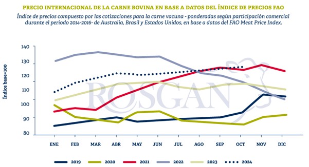 El índice de precios de referencia correspondiente al mes de octubre se sitúa en los 128 puntos básicos, lo que lo convierte en el nivel más alto para ese mes desde que se elabora esta serie (1990). En términos interanuales, la suba de valores respecto de los niveles registrados en octubre de 2023 refleja una mejora del 8%, posicionándose apenas un 6% por debajo de los máximos registrados en 2022.