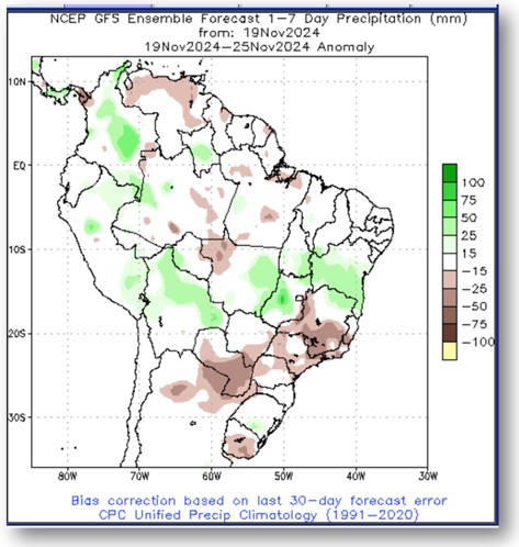 El mapa del USDA muestra las anomalías de humedad, que no solo cubre Brasil sino también Paraguay.