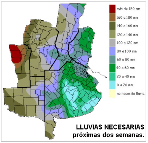 Como solemos mostrar en otras ocasiones, dejamos el mapa de necesidades hídricas para cuantificar la demanda de lluvias para la segunda parte del mes. Este mapa se construye a partir de la demanda de una pastura de referencia que tuvo consumo constante a lo largo de todo el año. Es decir es un planteo que en muchos sectores es un requerimiento máximo, sin embargo, permite delimitar patrones donde la demanda es difícil de satisfacer y detectar áreas de mayor riesgo de cara a sostener un buen nivel de humedad.