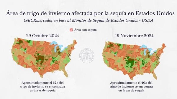 En Estados Unidos, que también venía siendo afectado por la falta de humedad, la lluvia trajo un gran alivio para los cultivos y el panorama cambió radicalmente. Al último final de semana de octubre, el Departamento de Agricultura de Estados Unidos (USDA) informaba que la condición de los cultivos se presentaba como la segunda peor en la historia para la fecha (38% del área cultivada en condiciones buenas y excelentes), mientras que 62% de la superficie de siembra del cereal se encontraba en condiciones de sequía.
