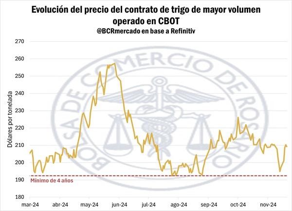 Tras estos sucesos, el valor del trigo en Chicago recuperó sus niveles previos a la fuerte caída de la semana pasada y se ubicó en USD 209,3/t al cierre del día de ayer.