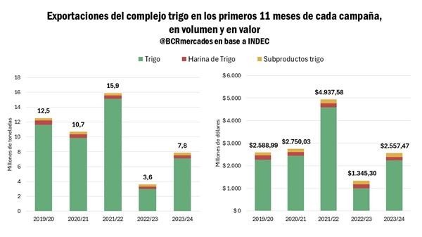 Al considerar al complejo como un todo, debemos adicionar las más de 375.000 toneladas de harina y las 340.000 toneladas de subproductos que se exportaron en lo que se lleva de la campaña 2023/24, para acumular 7.842.189 toneladas enviadas al exterior por el complejo triguero. Este volumen trajo consigo 2.558 mil dólares a la economía argentina, un 90% más que en igual período de la última campaña.