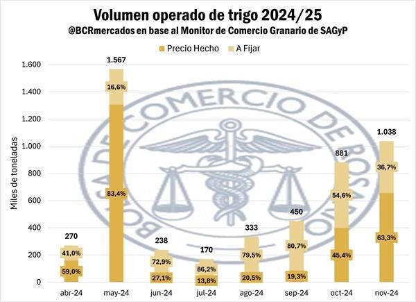 En los primeros 14 días hábiles del mes de noviembre se comercializó más trigo que durante todo el mes de octubre, 1.038.000 toneladas contra las 881.000 del mes pasado. El volumen de este mes ya representa más del 20% de todo lo comercializado del cereal de nueva cosecha. Además, se observa un cambio en la modalidad de los negocios, con una mayor participación de las operaciones con precio hecho.