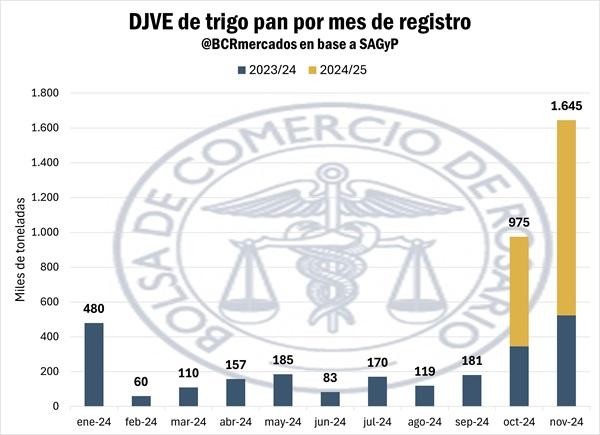 Esta aceleración en la dinámica comercial interna se replica en el frente externo. Después de atravesar solo dos tercios, noviembre ya se coloca como el mes con mayor volumen de Declaraciones Juradas de Venta al Exterior (DJVE) durante 2024, con 1.644.935 toneladas hasta ayer, superando las 975.400 de octubre, considerando todas las fechas de embarque.