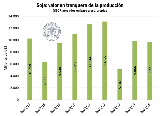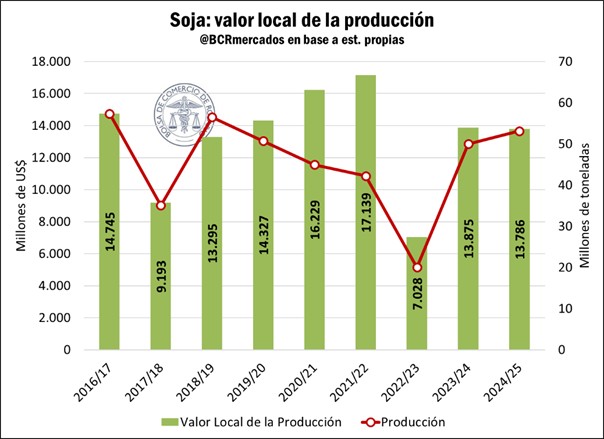 Del lado del volumen, se prevé, a la fecha, una recuperación del orden del 6% en la producción sojera del año próximo a 53,15 millones de toneladas, la más alta de los últimos seis años. Sin embargo, la suba de las cantidades no llega a compensar la caída en los precios, de modo que el valor local de la producción arroja una leve caída en relación con el año anterior (US$ 13.786 millones para la campaña 2024/25 versus US$ 13.875 millones en la 2023/24), aunque prácticamente duplica el resultado de la 2022/23, ciclo afectado por la peor sequía de los últimos 60 años.