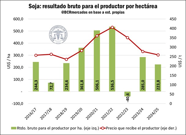 Finalmente, si al precio “en tranquera” recibido por el productor se le sustrae el costo directo de producción (semillas, insumos y labores), se arriba al resultado bruto para el productor. Bajo el escenario planteado, para la nueva campaña 2024/25 éste se proyecta en 223,8 dólares por hectárea, un 20% por detrás del año inmediato anterior e incluso un 25% por detrás del promedio de los últimos cinco años. En efecto, incluso si se deja de lado el tendal de pérdidas que dejó la sequía, aún nos encontramos con los márgenes brutos más ajustados desde la campaña 2017/18.