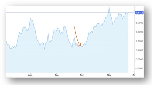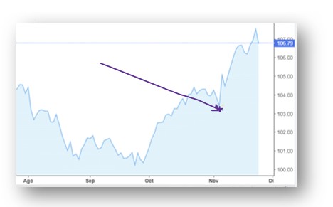 El gráfico que sigue (Investing.com) muestra la evolución del dólar-índice, desde agosto a la fecha. Claramente se nota cómo desde inicios de noviembre, con el resultado de las elecciones en EE.UU. el índice inicia una nueva pendiente a la suba.