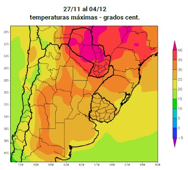 Debido a la entrada de vientos del Trópico, durante los días precedentes, la primera etapa de la perspectiva comenzará con temperaturas máximas muy sobre lo normal en el norte del área agrícola, y dentro de lo normal, pero con focos de valores intensos, en el centro y el sur, mientras la franja atlántica observará el ingreso de aire marino, con registros algo bajo la media estacional. El este del NOA, la mayor parte del Chaco, gran parte de la Mesopotamia, el norte de Córdoba y el oeste de la Región Pampeana observarán temperaturas máximas superiores a 30°C, con un foco calurosos con registros superiores a 40°C hacia el norte. El centro del NOA, el centro de Cuyo, la mayor parte de la Región Pampeana y gran parte del Uruguay observarán temperaturas máximas entre 25 y 30°C, con focos con valores inferiores. El oeste del NOA, el oeste de Cuyo y el este y el sur de Buenos Aires observará temperaturas máximas inferiores a 25°C, con focos con valores menores.
