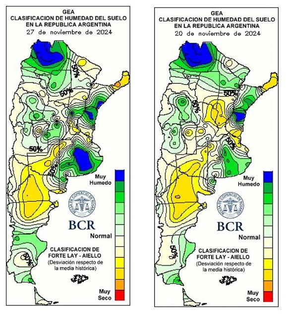 De acuerdo con la red de estaciones meteorológicas de GEA-BCR, hay localidades que casi duplicaron los promedios históricos, que suelen ser de entre 75 y 100 mm para noviembre. Por ejemplo, Carlos Pellegrini acumuló 153 mm, Hernando 148 mm, Montes de Oca 140 mm y Baradero 138 mm. Sin embargo, no todas las áreas compartieron la misma suerte: en sectores como Pujato y Rosario, las lluvias quedaron por debajo de la mitad de la media histórica, con apenas 31 mm y 47 mm, respectivamente.