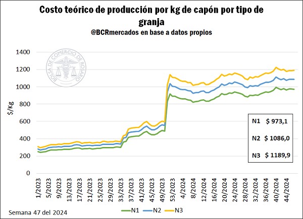 Por el lado de los costos, en la semana número 47, los costos promedios de las granjas N1 fueron de $ 973,1 por kilogramo de capón, para los establecimientos N2 de $ 1.086,0 /kg y para las N3 de $ 1.189,9 /kg. En la última semana, los costos se mantuvieron relativamente estables y, en lo que va del año, su aumento promedio fue del 8,2%.