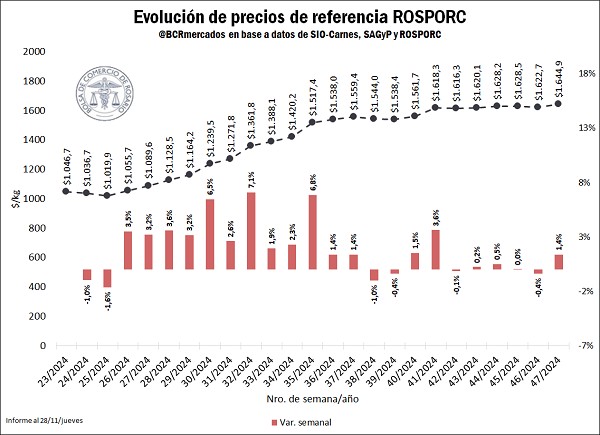 El Precio de Referencia para los capones, calculado bajo la metodología de cálculo de ROSPORC, alcanzó durante la semana número 47, del 18 al 24 de noviembre, un valor de $ 1.644,93/kg. Comparado con la semana anterior, esto implica un aumento del 1,4%, mientras que respecto a la misma semana del año pasado representa un incremento del 108%. En tanto, en lo que va de 2024, el aumento registrado es del 27%.