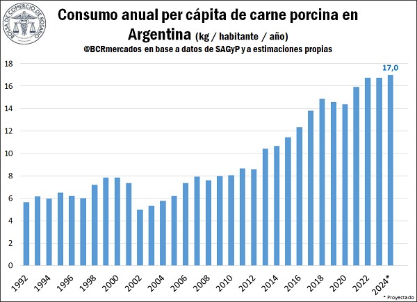 El consumo per cápita de carne porcina se ha duplicado en los últimos 12 años, pasando de un promedio por habitante de alrededor de 8,6 Kg en el año 2012 a un consumo estimado en 17 Kg/Hab en el año 2024. Este incremento refleja una tendencia clara hacia la diversificación en la dieta de los argentinos, quienes han comenzado a valorar más las propiedades nutricionales y el sabor de la carne de cerdo, en un escenario de mayor competitividad. Así, la carne porcina poco a poco le ha ido disputando terreno a la carne vacuna.