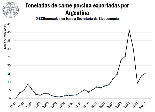 A pesar del crecimiento sostenido en la producción, las exportaciones de productos porcinos representan apenas el 2% del total producido en Argentina. Este bajo porcentaje evidencia que el mercado interno sigue siendo el principal destino, pero también resalta el potencial sin explotar en el comercio internacional. La apertura de nuevos mercados para las exportaciones porcinas provenientes de Argentina podría ser un incentivo para que la producción continúe su ininterrumpido sendero de crecimiento, además, permitiría que el sector sea más resiliente en contextos recesivos, como el que se atravesaba en el primer trimestre del año.