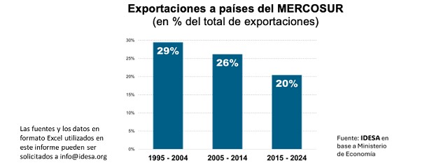 Estos datos muestran que en los 30 años de existencia del MERCOSUR las exportaciones argentinas hacia los países de la zona común muestran un franco declive en su participación. Así se llega a que apenas 1 de cada 5 dólares exportados tenga como destino alguno de los socios del acuerdo. Se trata de un hecho muy sugerente respecto al mal funcionamiento del acuerdo, ya que mientras las exportaciones dentro del MERCOSUR son –en teoría– libre de aranceles y trabas, las ventas a otros países pagan aranceles y sufren barreras de entrada.