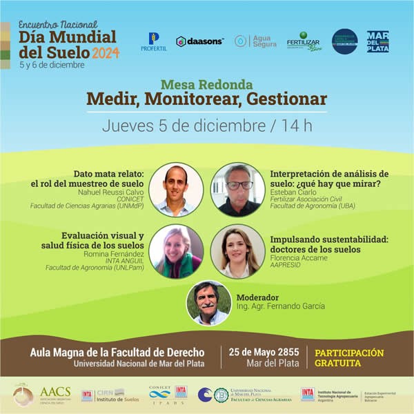 En conmemoración del Día Mundial del Suelo 2024, se llevará a cabo el Encuentro Nacional "Cuidar los Suelos. Medir, Monitorear, Gestionar", los días 5 y 6 de diciembre de 2024 en el Aula Magna de la Facultad de Derecho de la Universidad Nacional de Mar del Plata (UNMdP) en horarios de mañana y tarde, organizado por la Asociación Argentina de Ciencia del Suelo (AACS), junto con el Instituto de Suelos del INTA Castelar, el instituto IPADS (Conicet) y la Unidad Integrada Balcarce (Facultad de Ciencias Agrarias de la Universidad Nacional de Mar del Plata e INTA).