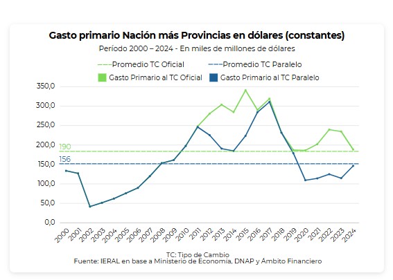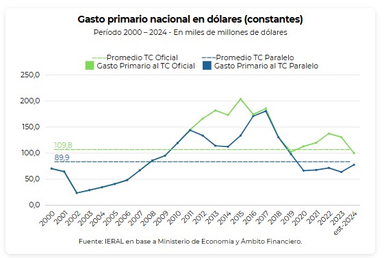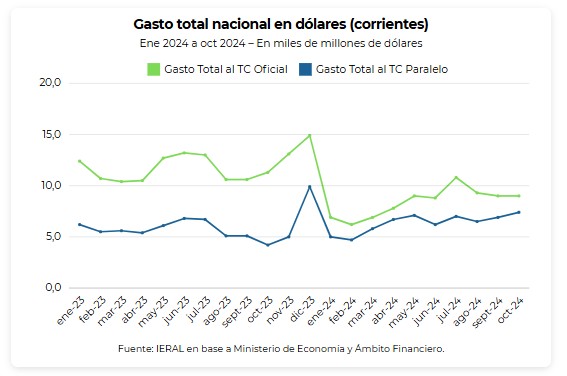 Si para efectuar la comparación se utiliza el dólar informal o paralelo, el gasto nacional en dólares se ubicaría en USD 78MM en 2024, un 57% menor al mayor del período, que corresponde al año 2017.