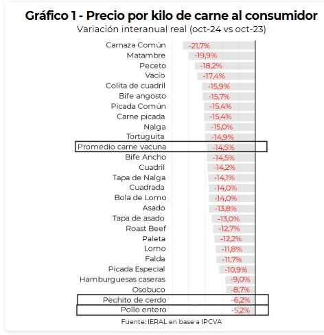 Las dos carnes sustitutas, el pollo y el cerdo, también se abarataron en relación al año pasado, pero mucho menos que proporcional (5 y 6% interanual real, respectivamente).