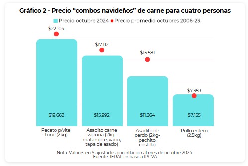 Al mes de octubre 2024 estas opciones tuvieron un costo total de $ 19.662, $ 15.992, $ 11.364 y $7.155, respectivamente, es decir, unos $4.916 por persona el peceto, $3.998 el asadito “de vaca”, $2.841 el asadito de cerdo y $ 1.789 el pollo. Si se comparan estos valores con el precio histórico de cada “combo” traído a valor presente (precio promedio de “todos los octubres” 2006 – 2023 ajustado por inflación), se encuentra que todas las opciones estuvieron más baratas en 2024 (gráfico 2), en efecto: