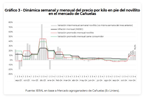 Nótese que en noviembre de este año el novillito volvió a aumentar (barras grises) luego de estar varios meses “planchado”, aumentando menos que la inflación durante la mayor parte del año e incluso cayendo en términos nominales los últimos tres meses (agosto – octubre). Las subas de noviembre fueron del 3,1% intermensual en la primera semana (vs primera semana oct-24), del 7,2% en la segunda, del 8,6% en la tercera y del 19,2% en la cuarta (“punta a punta”). En promedio, el novillito aumentó 9,5% intermensual en noviembre, cifra que se ubica bastante por encima de la inflación esperada para este mes (2,5 – 2,9%), una muy buena noticia para los productores ganaderos dado que el precio real del animal no aumentaba desde febrero.