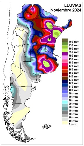 La recirculación de aire húmedo y la alta frecuencia de ondas que transitaron las zonas productivas, dejaron montos pluviales muy satisfactorios en las principales zonas agrícolas del país. No solo se produjeron lluvias por pasajes frontales, sino que se dieron también muchos eventos débiles vinculados a la sobresaturación del ambiente. La mezcla con algún pulso frío favoreció la rápida formación de nubes bajas y medias que dejaban chaparrones que marcaron al mes de noviembre con una alta recurrencia pluvial. Dentro de esta contexto de alta disponibilidad de humead, también se dieron eventos con desarrollo de tiempo severo, sobre todo en las provincias del centro en la última decena de días del mes.