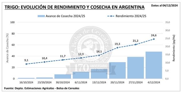 Tras un progreso intersemanal de 9,4 p.p., la cosecha alcanzó el 48,1% del área apta. El rinde promedio asciende a 24,6qq/Ha. La proyección de producción se mantiene en 18,6 MTn, pero podría aumentar de continuar registrando rendimientos superiores a los estimados.