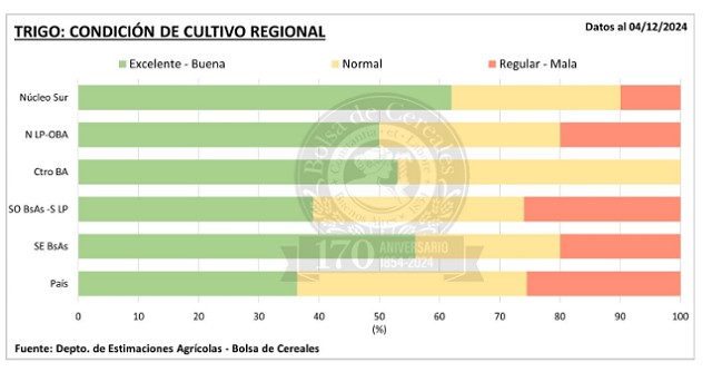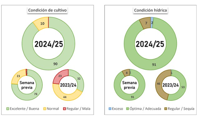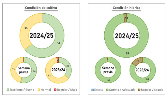 El avance de siembra se encuentra en 47,8% del total estimado. Gracias a la buena humedad en los perfiles los cultivos reportan una condición entre Normal y Excelente en el 98,4 % de los casos.