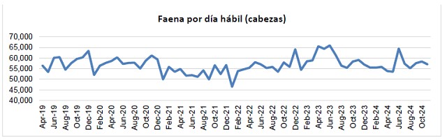 La faena diaria del mes de noviembre del corriente año, se ubicó en 57,0 mil cabezas, un (-2,2%) por debajo de las 58,3 mil diarias procesadas en octubre, y un (-3,5%) por debajo de las 59,1 mil correspondientes a noviembre de 2023.
