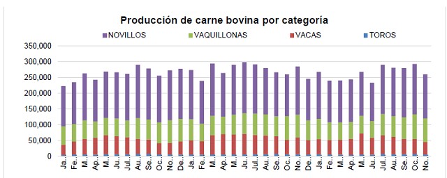 La producción de carne bovina del mes de noviembre de 2024 alcanzó las 259,8 mil toneladas res con hueso, recortándose en cerca de 33,0 mil toneladas con respecto al mes anterior, y retrocediendo en 25,0 mil toneladas con respecto al mes de noviembre del año 2023. En los primeros once meses del año 2023, la producción de carne bovina alcanzó los 2,894 millones de toneladas equivalente res con hueso; situándose 147,0 mil toneladas por debajo del acumulado del período enero a noviembre de 2023, que había ascendido a 3,041 millones de toneladas equivalente res con hueso.