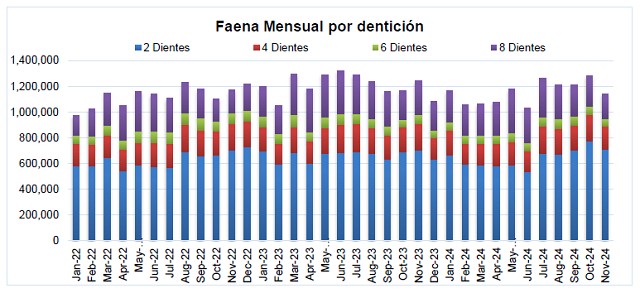 Tomando el periodo correspondiente a enero – noviembre de 2024, las hembras de 2 Dientes, que representan el 22% de la faena acumulada en los primeros once meses del año 2024, muestran un peso de 190,7 kilogramos, 37,7 kg por debajo del peso promedio para todas las categorías; y las hembras de 8 o más dientes, que representan un 16% de la faena y muestran un peso de 227,8 kg; que resulta 0,6 kilogramos inferior al promedio, que en el periodo enero – noviembre de 2024 resultó de 228,4 kilogramos.