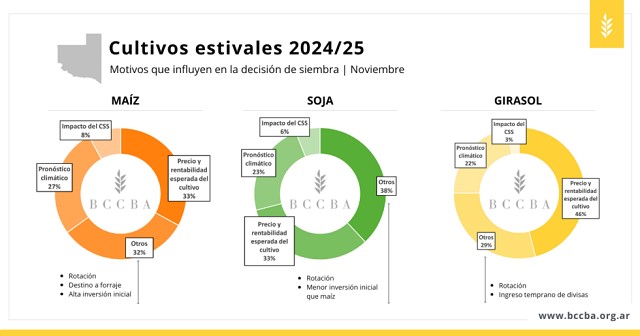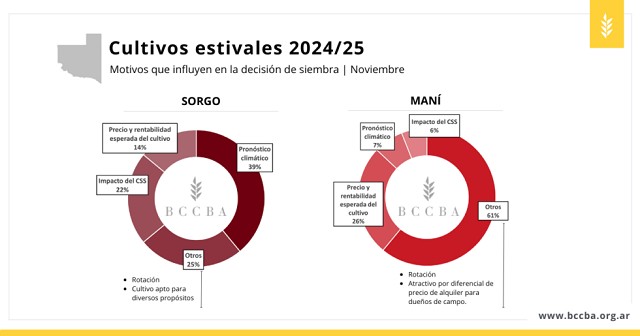 En el caso del girasol, los principales factores que impulsan su siembra son el precio y la rentabilidad esperada, seguido de la rotación de cultivos y la ventaja de generar ingresos tempranos de divisas. Por otro lado, el marcado aumento en la superficie sembrada de maní responde a su atractivo diferencial de precio, lo que ha llevado a muchos propietarios de tierras a optar por alquilar sus campos para este cultivo, además de su rol en la rotación.